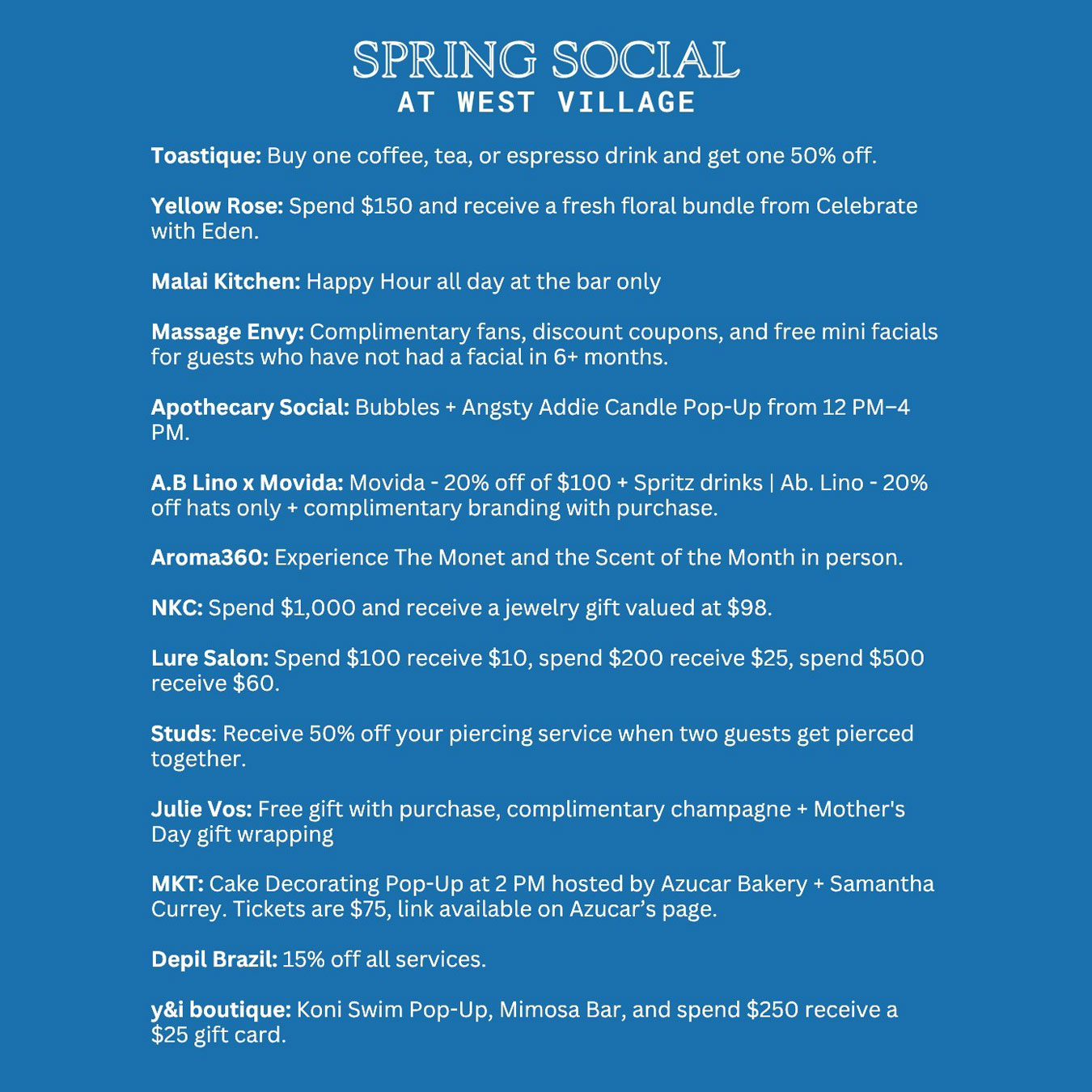 Join us May 9th for Spring Social at West Village — an all-day neighborhood celebration filled with shopping, specials, pop-ups, beauty experiences, bites, bubbles, and live music.